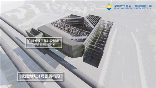 通過三維可視化BIM模型分析周邊地理環(huán)境對(duì)基坑帶來的影響,采取針對(duì)性的基坑支護(hù)方案。白鵝潭國際金融中心項(xiàng)目位于兩條交通主干道交界處,臨近地鐵線路,周邊環(huán)境復(fù)雜。利用BIM技術(shù)可以直觀地展示項(xiàng)目周邊地鐵線路、管廊以及在建工作井與項(xiàng)目支護(hù)構(gòu)建的關(guān)系,分析項(xiàng)目施工難點(diǎn)以及應(yīng)對(duì)措施的可行性,從而為項(xiàng)目匹配最優(yōu)的基坑支護(hù)方案,即地下連續(xù)墻加內(nèi)支撐支護(hù)方案。